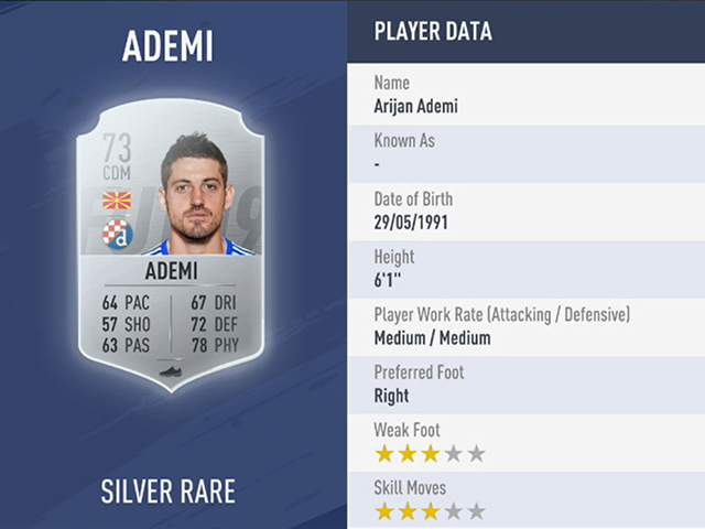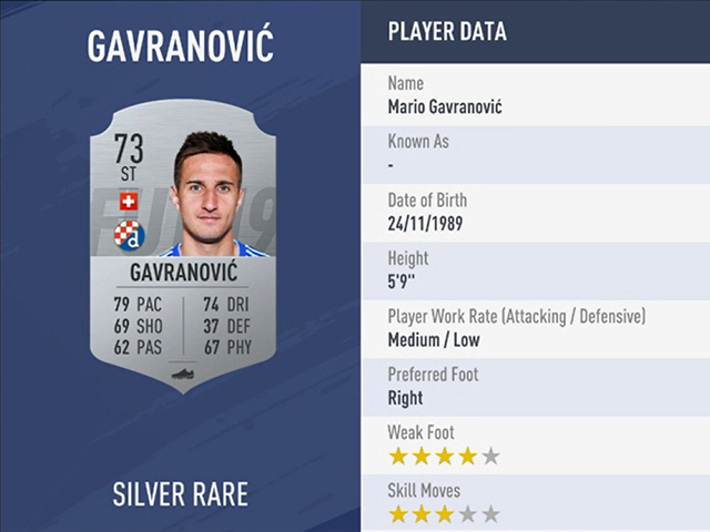 Gavranović joined Dinamo only in January 2018 but already netted 11 times for the club. He’s a natural-born striker with quality finishing (72) and mobility (pace 79) who’s not easy to take the ball off him due to solid dribbling (74).