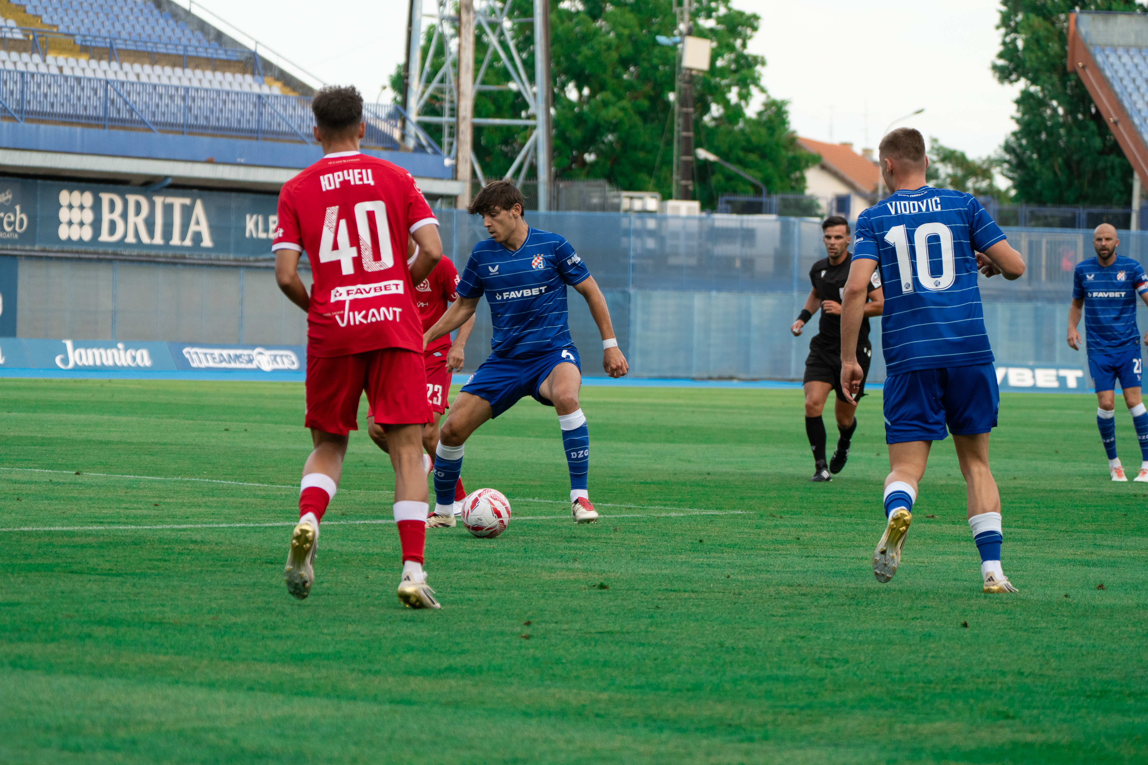 Siloviti početni napadi plavih isprovocirali su i crveni karton suparničkom desnom beku, Janu Jurčecu. Mišić je filigranskom dubinskom loptom kroz srce Kryvbasova veznog reda izgurao Vidovića samog pred vratara. Ipak, maksimirsku je desetku s leđa omeo Jurčec i zaradio isključenje. Dakako, u ovakvim prilikama, u pripremnim utakmicama, sukladno dogovoru klubova, ipak su obje momčadi nastavile igru sa svih 11 igrača, umjesto Jurčeca je u toj 13. minuti s klupe uskočio Yaroslav Shevchenko. Uslijedio je gromoviti Kulenovićev slobodan udarac, lopta je “probila živi zid”, a vratar ipak nekako uspio spriječiti pogodak.