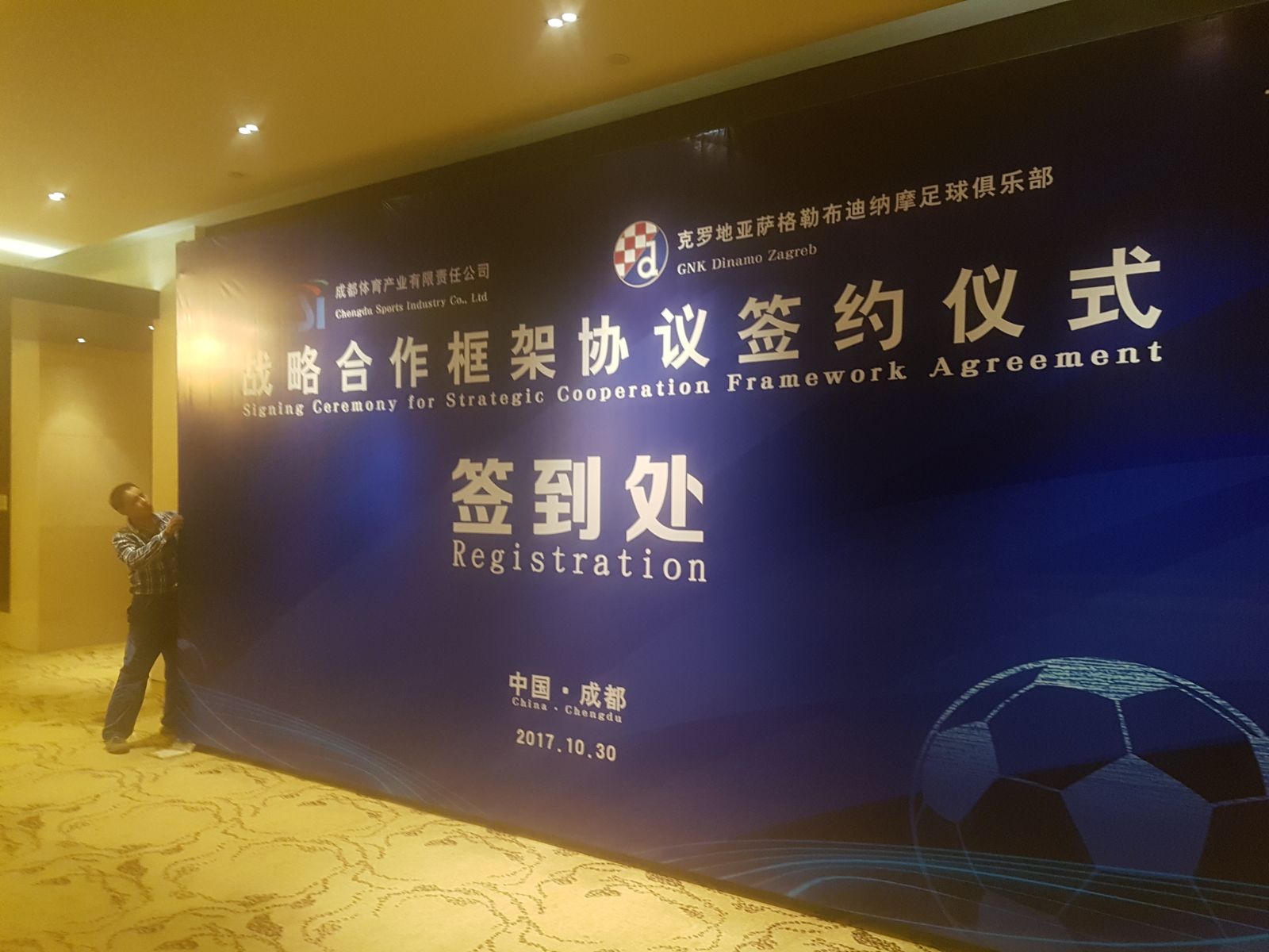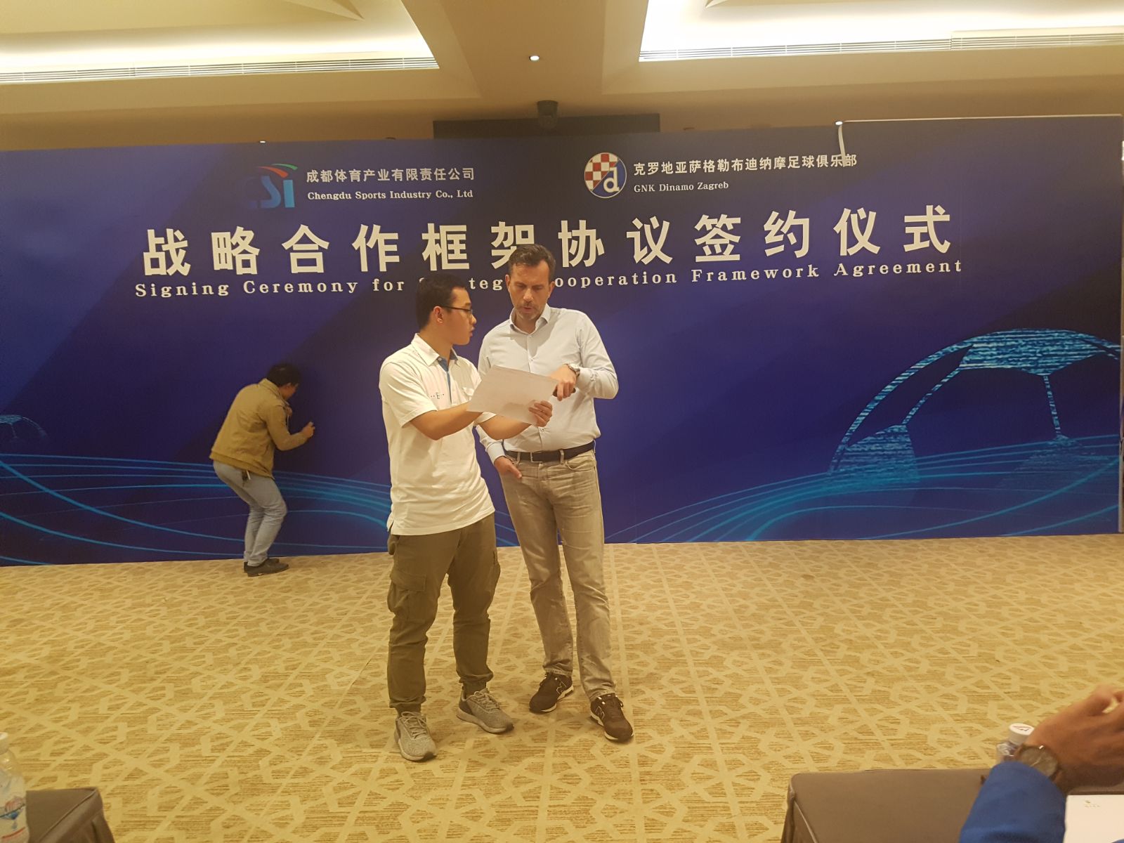 Modri su klub u NR Kina na potpisivanju predstavljali glavni direktor Tomislav Svetina, direktorica za međunarodne odnose Amra Peternel, direktor marketinga, prodaje i komunikacija Tomislav Rukavina i zamjenik direktora Nogometne škole Anđelko Ivanjko. Događaju je prisustvovao i Veleposlanik RH u NR Kina, gospodin Nebojša Koharović.