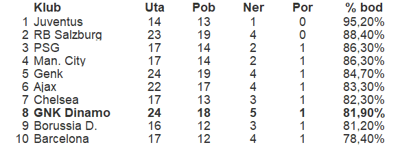 Do sada u sezoni momčad pod vodstvom glavnog trenera Nenada Bjelice odigrala je ukupno 24 natjecateljske utakmice, pritom je ostvarila 18 pobjeda, pet remija i jedan poraz uz gol-razliku 51:15. Po uspješnosti Dinamo ima 81,9 posto osvojenih bodova, ispred moćne Barcelone i Borussije Dortmund.