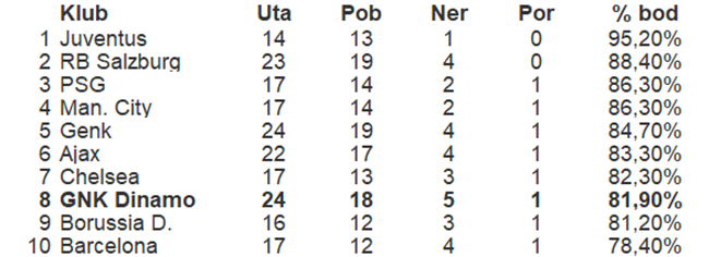 Dinamo je po dosadašnjem učinku u sezoni 2018/19. među najuspješnijim klubovima Starog kontinenta. Kad gledamo svih 80 klubova koji nastupaju u grupnim fazama UEFA Lige prvaka i UEFA Europa lige, Dinamo je osmi najuspješniji klub u Europi!