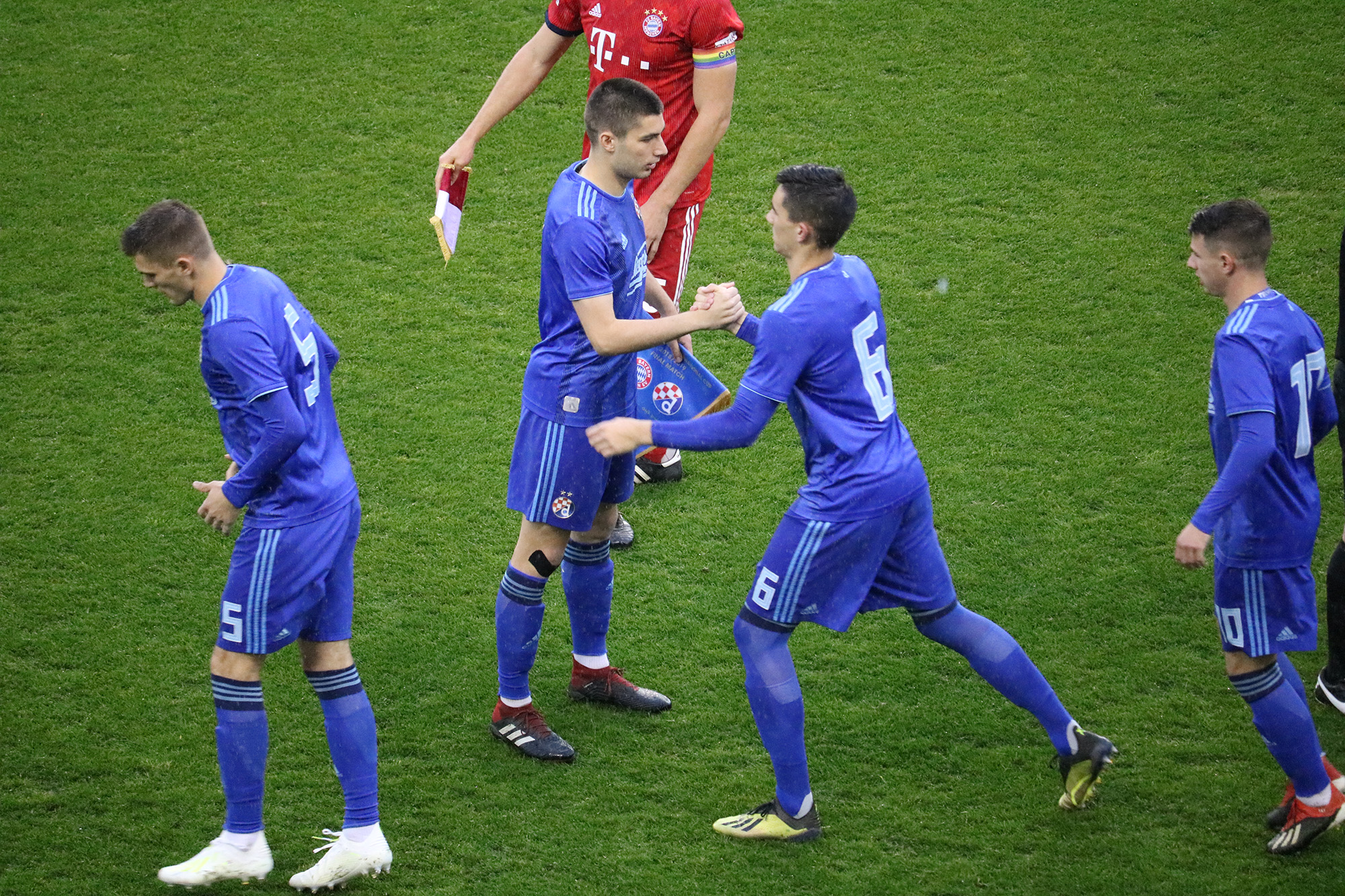 Za Dinamo su na travnjak protiv Bayerna istrčali na golu Horkaš, stoperi Šutalo i Franjić, a na bokovima Barišić i Gogić. Zadnji vezni Moro i Gjira, a vezna linija Ćuže, Tolić i Marin. Špica je bio Šipoš.