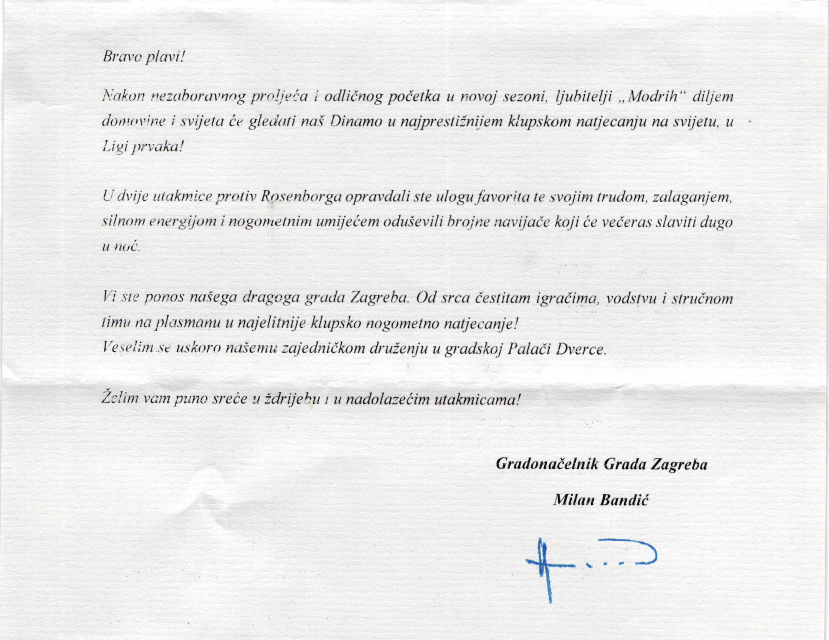 Posebna nam je čast primiti čestitku našeg počasnog predsjednika i gradonačelnika Zagreba Milana Bandića i od srca se zahvaljujemo na lijepim riječima.