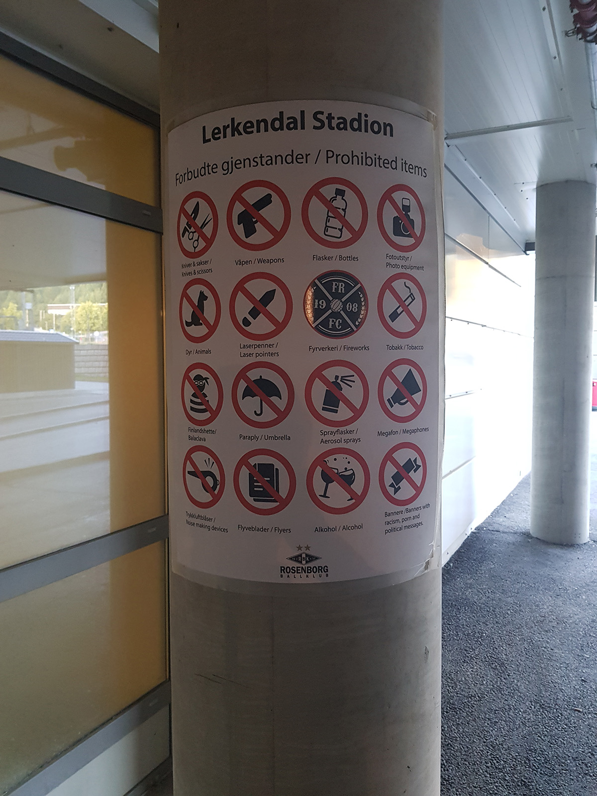 - noževi, oružje i drugi predmeti kojim je moguće ozlijediti drugu osobu, pirotehnika, dimne bombe, staklene boce, plastične boce, alkohol i drugi opijati, megafon, transparenti i zastave s rasističkim, diskriminatornim i političkim porukama, laseri, oprema za prekrivanje lica, SLR kamere; zabranjen je govor mržnje, agresivno ponašanje, ulazak u teren, ubacivanje objekata i iskazivanje rasističkih stavova