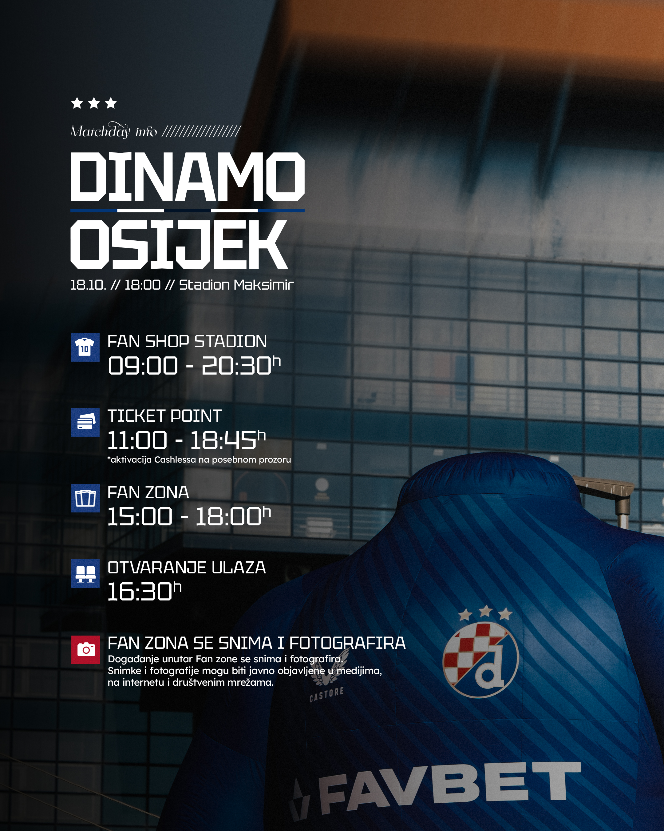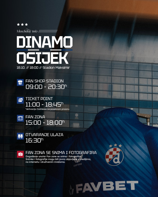 Fan zona nije samo uvod u utakmicu, već i prilika za zajedničko okupljanje, stvaranje uspomena i izražavanje navijačke strasti. Pozivamo sve navijače i ljubitelje sporta da nam se pridruže i budu dio derbija koji ćemo pamtiti po zajedništvu, emocijama i nezaboravnom doživljaju. Dođite na derbi s Osijekom s navijačkim šalovima, stvorimo atmosferu za pamćenje, nezaboravnu uspomenu i podržimo naše dečke u borbi za još jednom pobjedom.