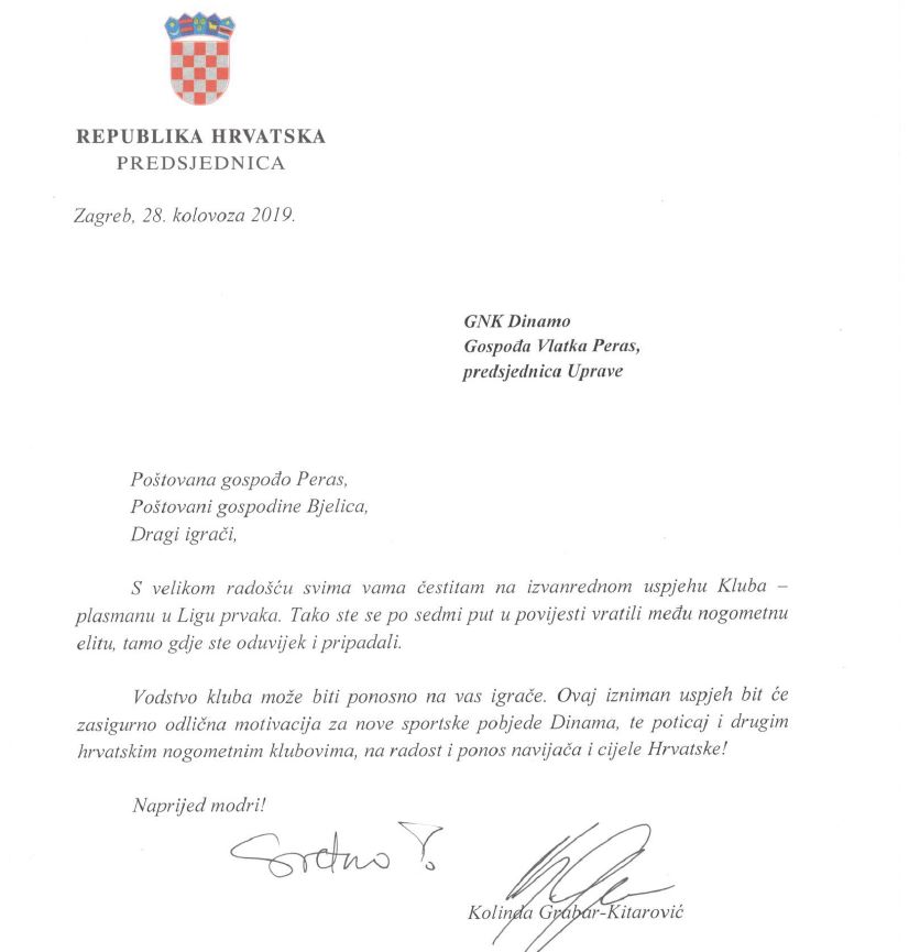 Svaku čestitku primili smo s velikim ponosom, sretni da smo sportskim uspjehom u najelitnijem nogometnom natjecanju na svijetu razveselili sve vas. Isto tako, moramo istaknuti kako smo se posebno obradovali čestitki Predsjednice Republike Hrvatske Kolinde Grabar Kitarović kojoj ovim putem posebno zahvaljujemo na riječima potpore.