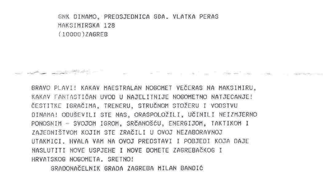 Dinamu je na velikoj pobjedi čestitao i počasni predsjednik kluba, gradonačelnik Zagreba g. Milan Bandić.