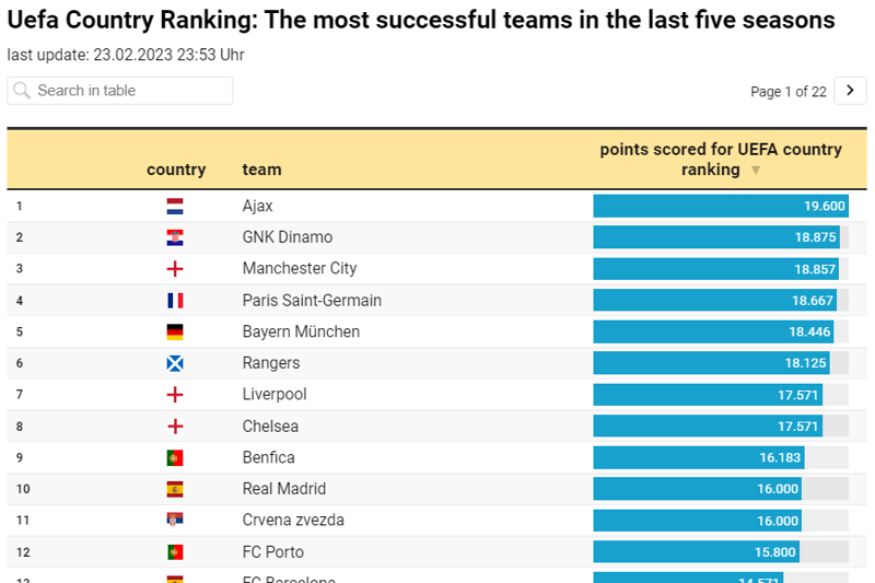 Ispod Dinama su ostali i najrenomiraniji europski velikani poput Real Madrida, Liverpoola, Manchester Cityja, Bayerna, Barcelone, Manchester Uniteda i ostalih.