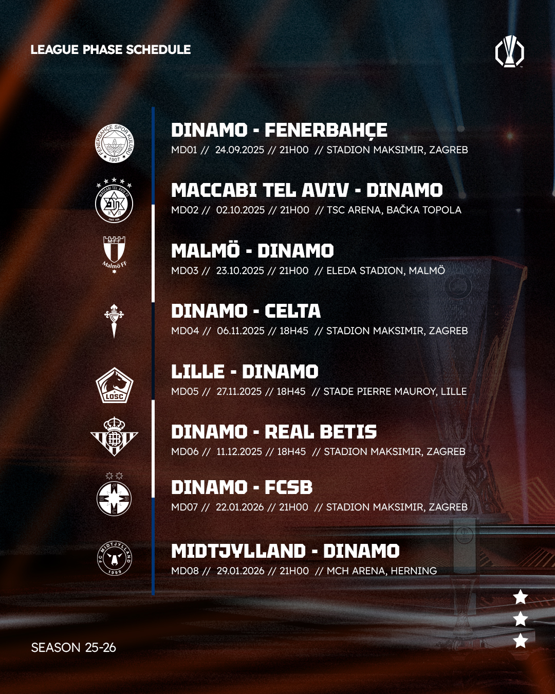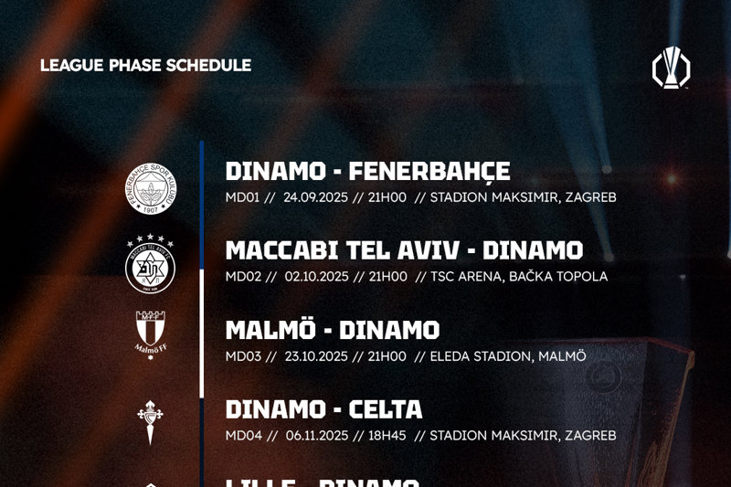 Dinamovi nogometaši novu će europsku sezonu otvoriti na svom travnjaku, a gost na startu nadmetanja u ligaškoj fazi UEFA Europa lige bit će turski Fenerbahçe u srijedu, 24. rujna, u 21 sat. Završni dvoboj ligaške faze plavi će odigrati 29. siječnja sljedeće godine u gostima kod danskog Midtjyllanda. Nakon što je u petak u Monte Carlu održan ždrijeb ligaškog dijela natjecanja sad su poznati i kompletan raspored i satnica svih utakmica.