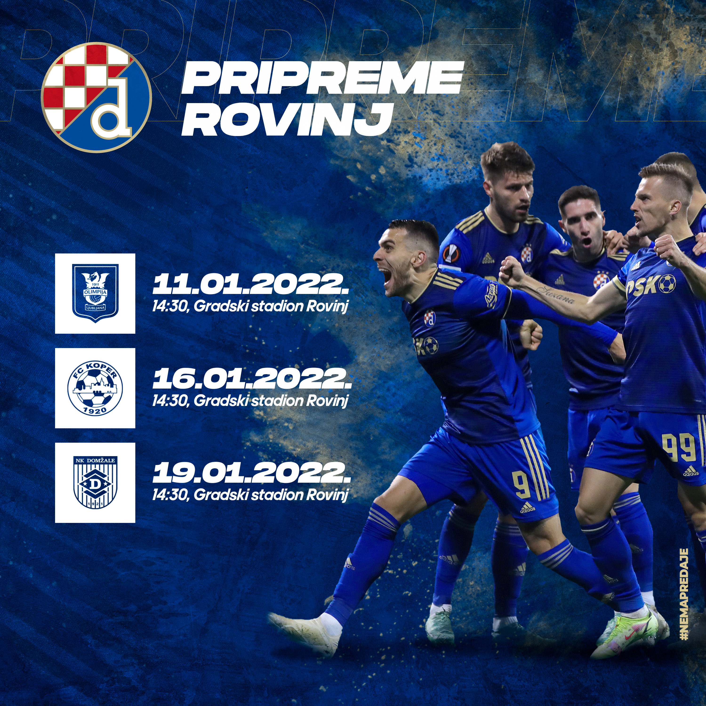 Na rasporedu su tri prijateljske utakmice za vrijeme boravka momčadi u Rovinju. Već u utorak 11. siječnja snage će odmjeriti Dinamo i slovenska Olimpija, 16. siječnja u drugom pripremnom susretu protivnik zagrebačke ekipe bit će Koper, dok je posljednja utakmica 19. siječnja kada će se plavi sučeliti s momčadi Domžale. Sve utakmice odigrat će se u 14:30 sati.