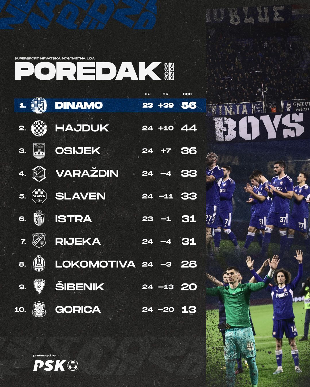 Svoj deveti pogodak sezone u prvenstvu na spomenutoj je utakmici zabio Bruno Petković i tako donio novi bod plavima, koji na vrhu ljestvice sada imaju ukupno 56 bodova i utakmicu manje. Drugoplasirani Hajduk na svom kontu ima 44 boda, dok Gorica na začelju lige ima 13 bodova.