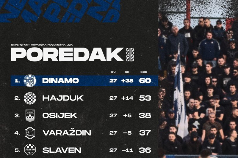 Nakon 27 kompletiranih kola u SuperSport HNL-u Dinamo je sedam bodova ispred svog rivala Hajduka. Plavi su u subotu gostovali u Gorici i vodili do 85. minute, a onda nažalost ostali bez dva boda.