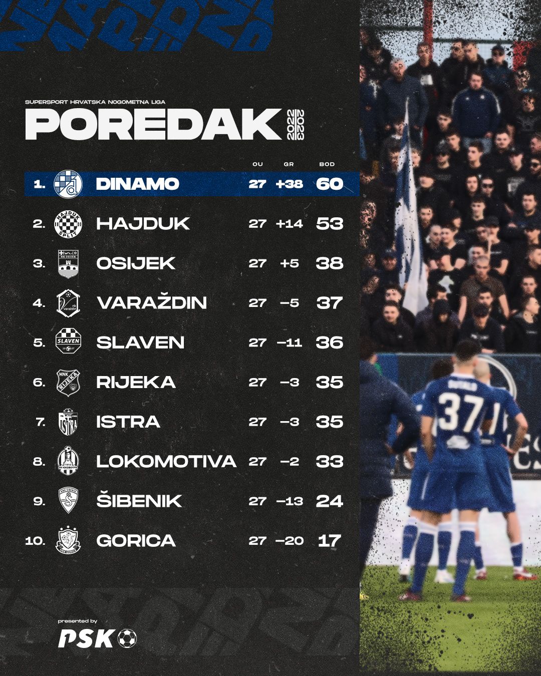 Nakon 27 odigrana kola Dinamo na prvenstvenoj ljestvici ima 60 bodova, dok Hajduk na drugom mjestu na svom kontu ima 53 osvojena boda. Na začelju ljestvice nalazi se Gorica sa 17 bodova, sedam manje od pretposljednjeg Šibenika.