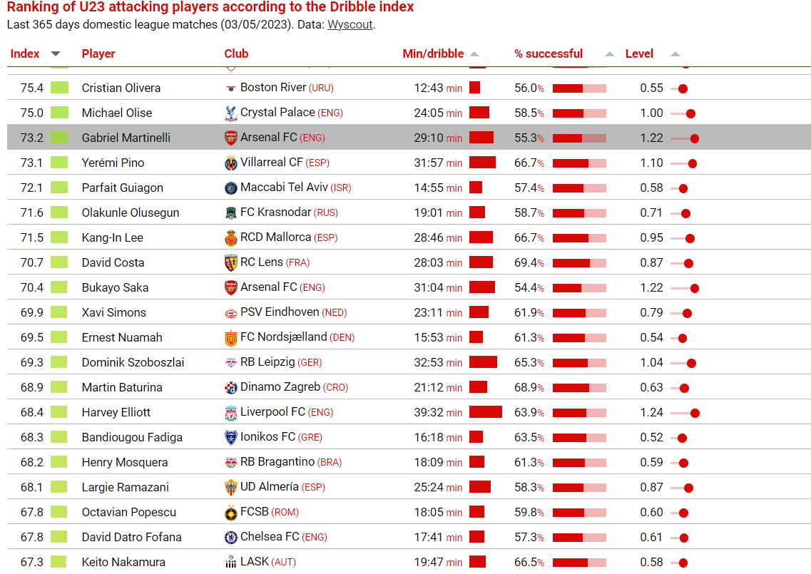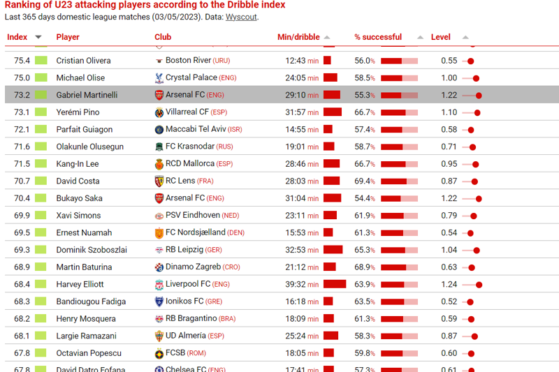 U svom je izračunu CIES načinio rang ljestvicu sukladno indeksu koji je ukomponirao učestalost i postotak uspješnosti driblinga kao i kvalitativnu razinu suigrača i suparnika.
