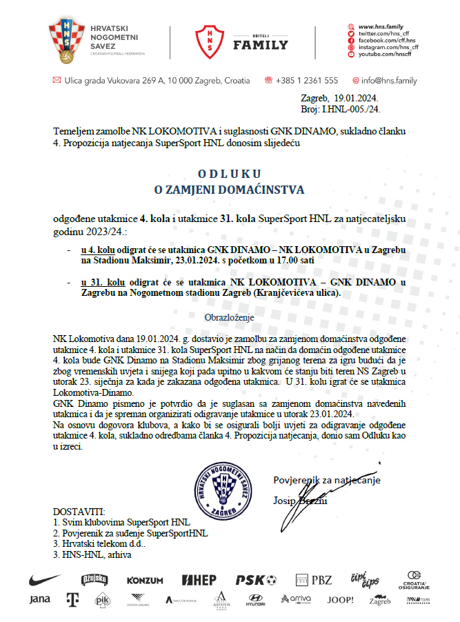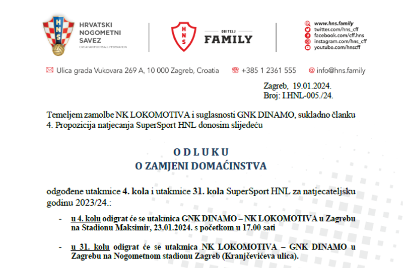 Temeljem zamolbe NK Lokomotiva i uz suglasnost GNK Dinamo, povjerenik za natjecanje Prve HNL donio je odluku o zamjeni domaćinstva zaostale utakmice 4. kola SuperSport HNL-a pa će tako spomenuta utakmica između NK Lokomotiva i GNK Dinamo biti odigrana na stadionu Maksimir, u utorak 23. siječnja u 17:00 sati.